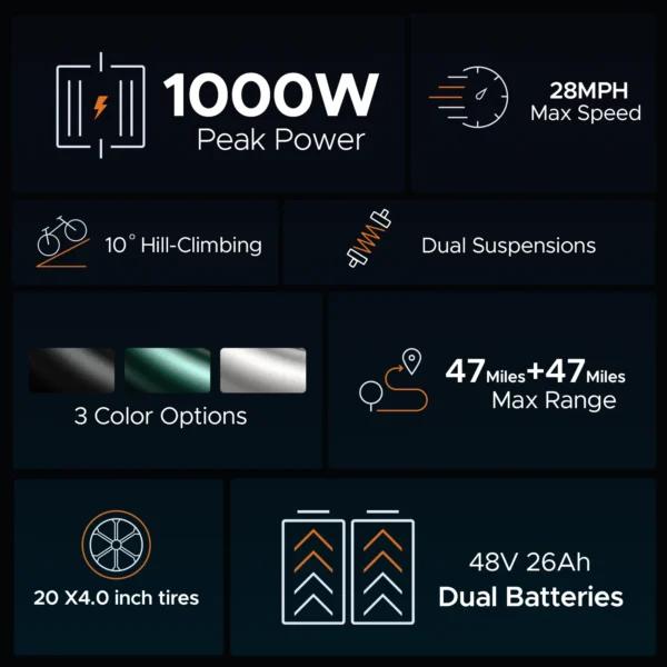 🔋 Langtidsholdbart batteri – 48V 13Ah aftageligt batteri giver 75 km (45 mi) i assistancetilstand eller 35 km (22 mi) i kun gashåndtagstilstand