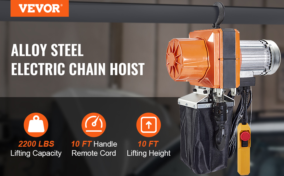 2200 lbs Load Capacity: Our electric chain hoist is equipped with a G100 chain to provide a safe lifting capacity of 2200 lbs/998 kg. It can lift all kinds of heavy objects at a speed of 10.5 ft/min (3.2 m/min) with a maximum lifting height of 10 ft/3 m.